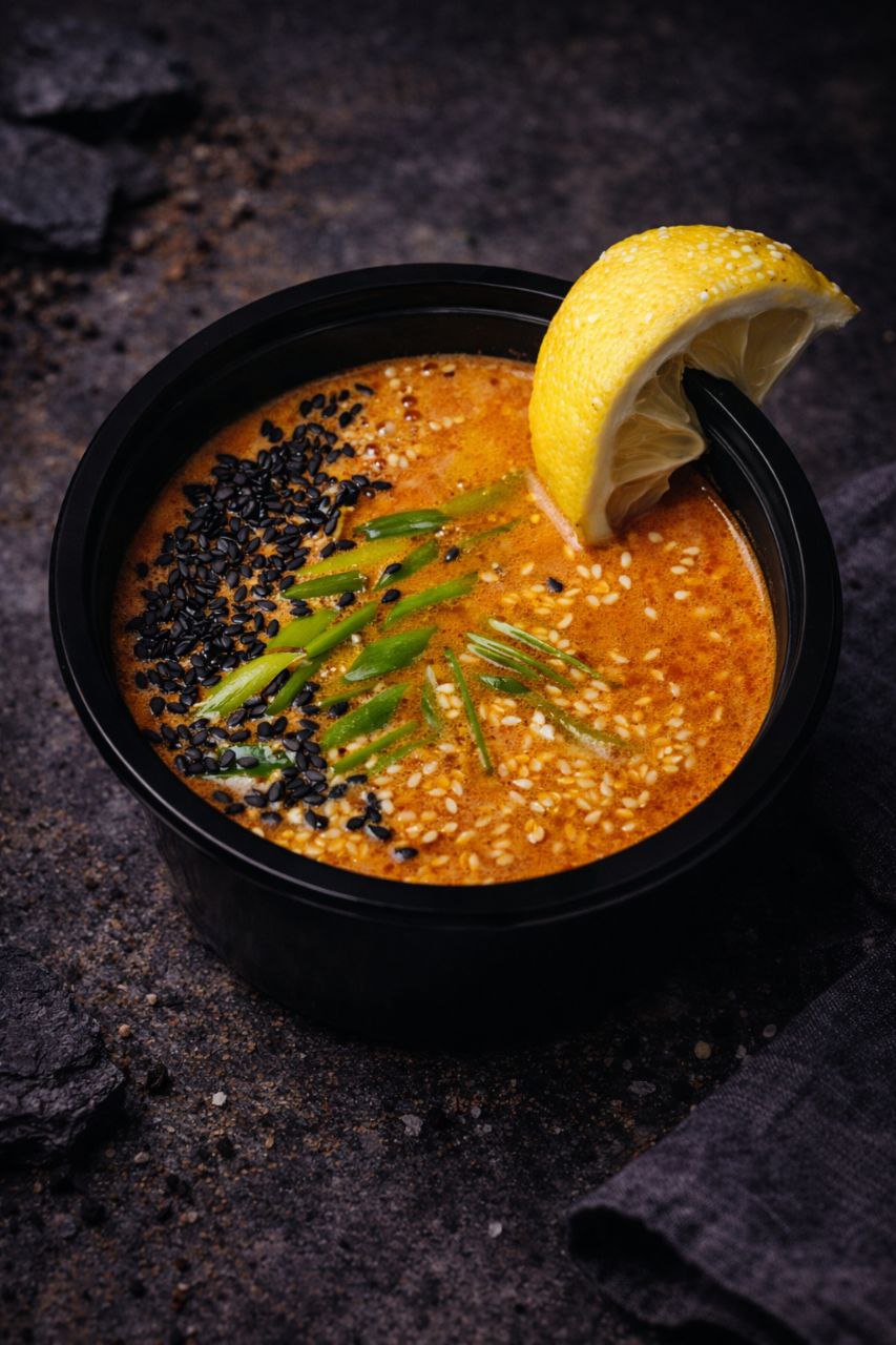 Склад: Креветки, Гриби Шиїтаке, Помідори, Том Ям паста, Кокосове молоко (вершки), Рис.
