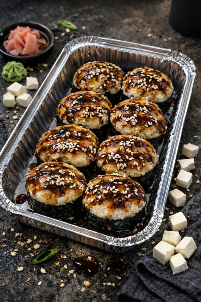 Склад: Норі, Рис, Сир Філадельфія, Огірок, Грильований лосось, Пармезан, сир Моцарелла, Майонез, соус Теріякі.